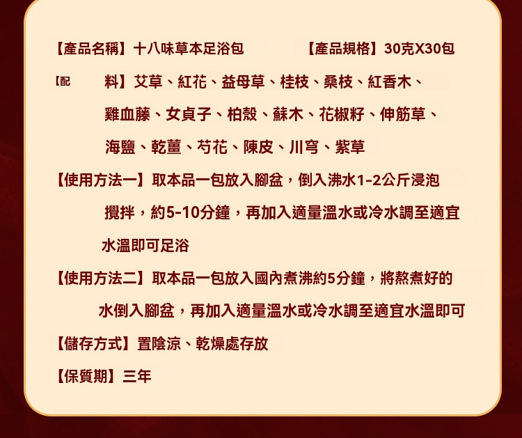 {{ order.time }}【訂購了】排濕去寒18味草本足浴包 30g×30入(泡腳包 中藥包 足浴包 泡澡 排濕 助眠 薰蒸 紓壓)